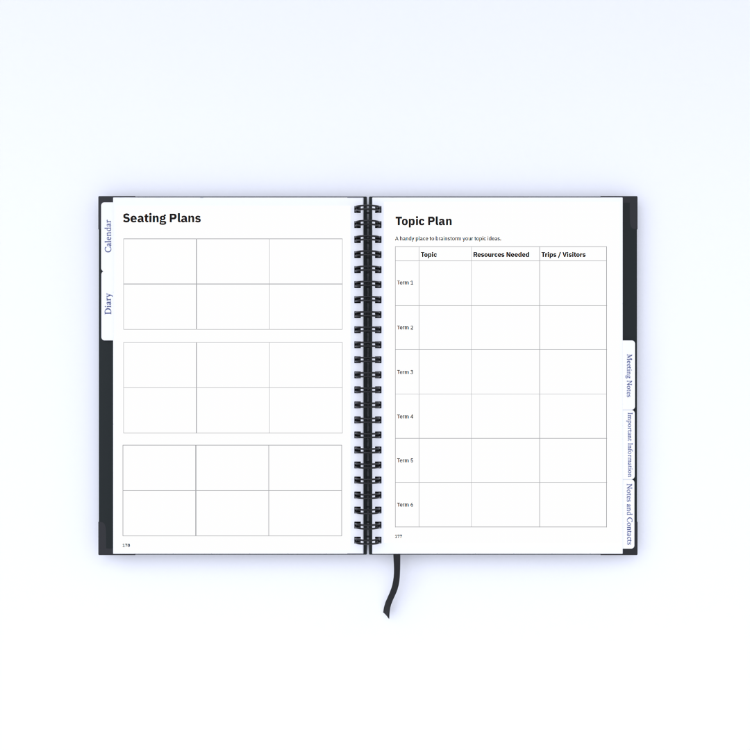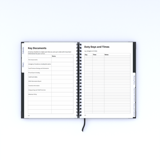 Staffing, key documents, duty days, timetables, topic planning, seating plans, display ideas, groups, performance management log, CPD log, assembly planner, newsletter updates, pupil information and notes and contacts.