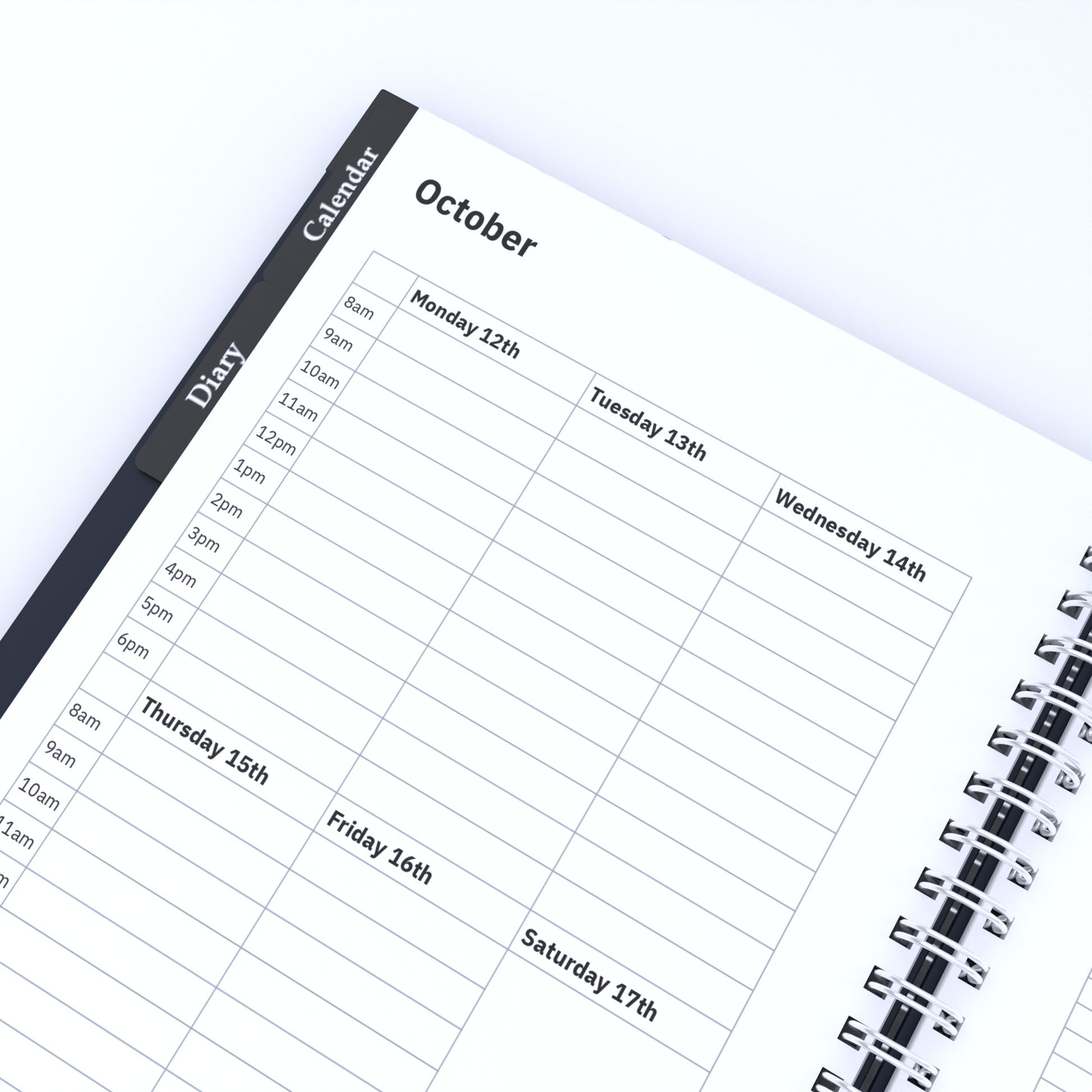 Weekly diary spreads with time-blocking (8am–6pm)