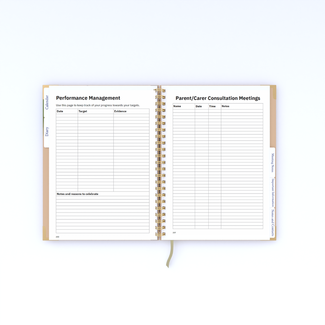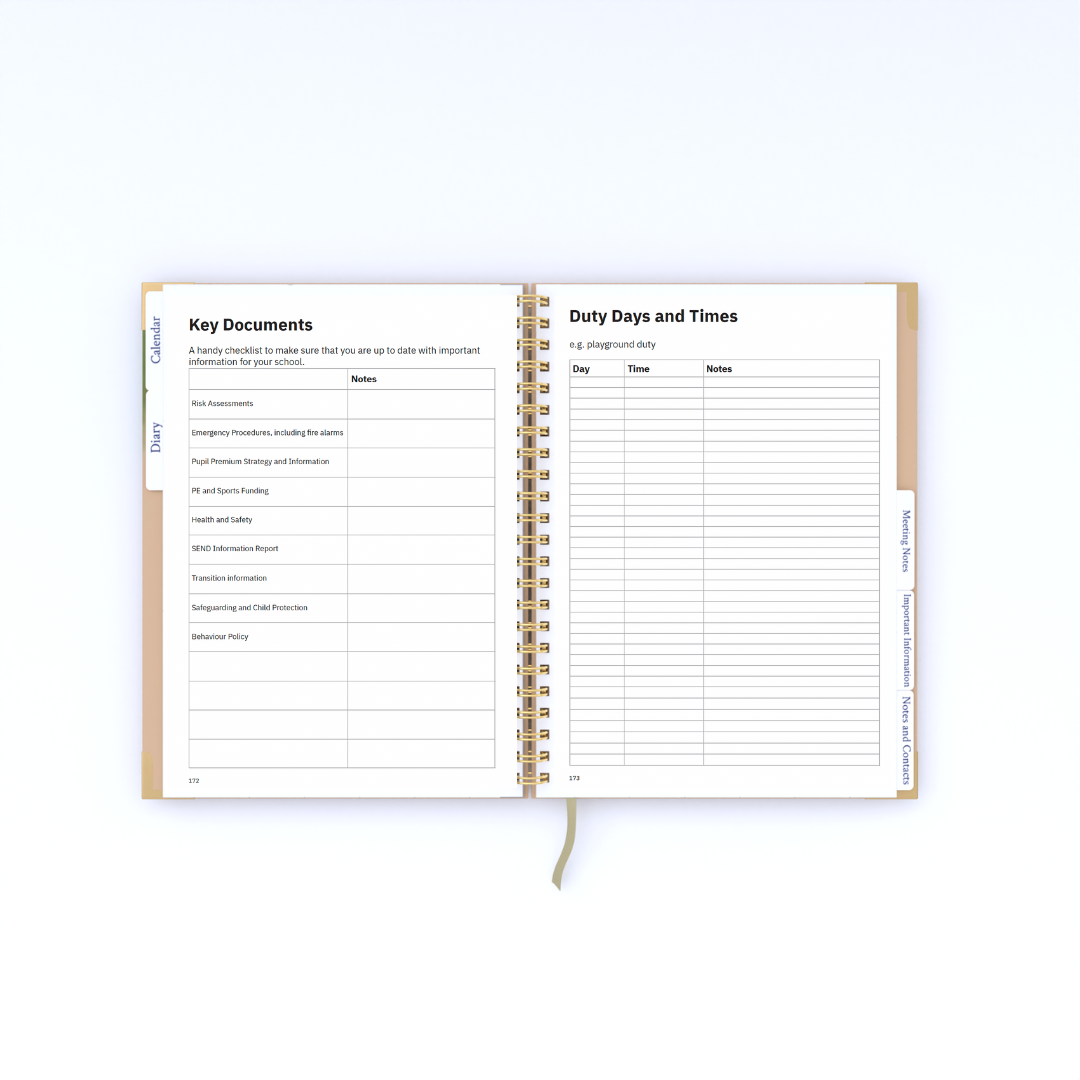 Staffing, key documents, duty days, timetables, topic planning, seating plans, display ideas, groups, performance management log, CPD log, assembly planner, newsletter updates, pupil information and notes and contacts.